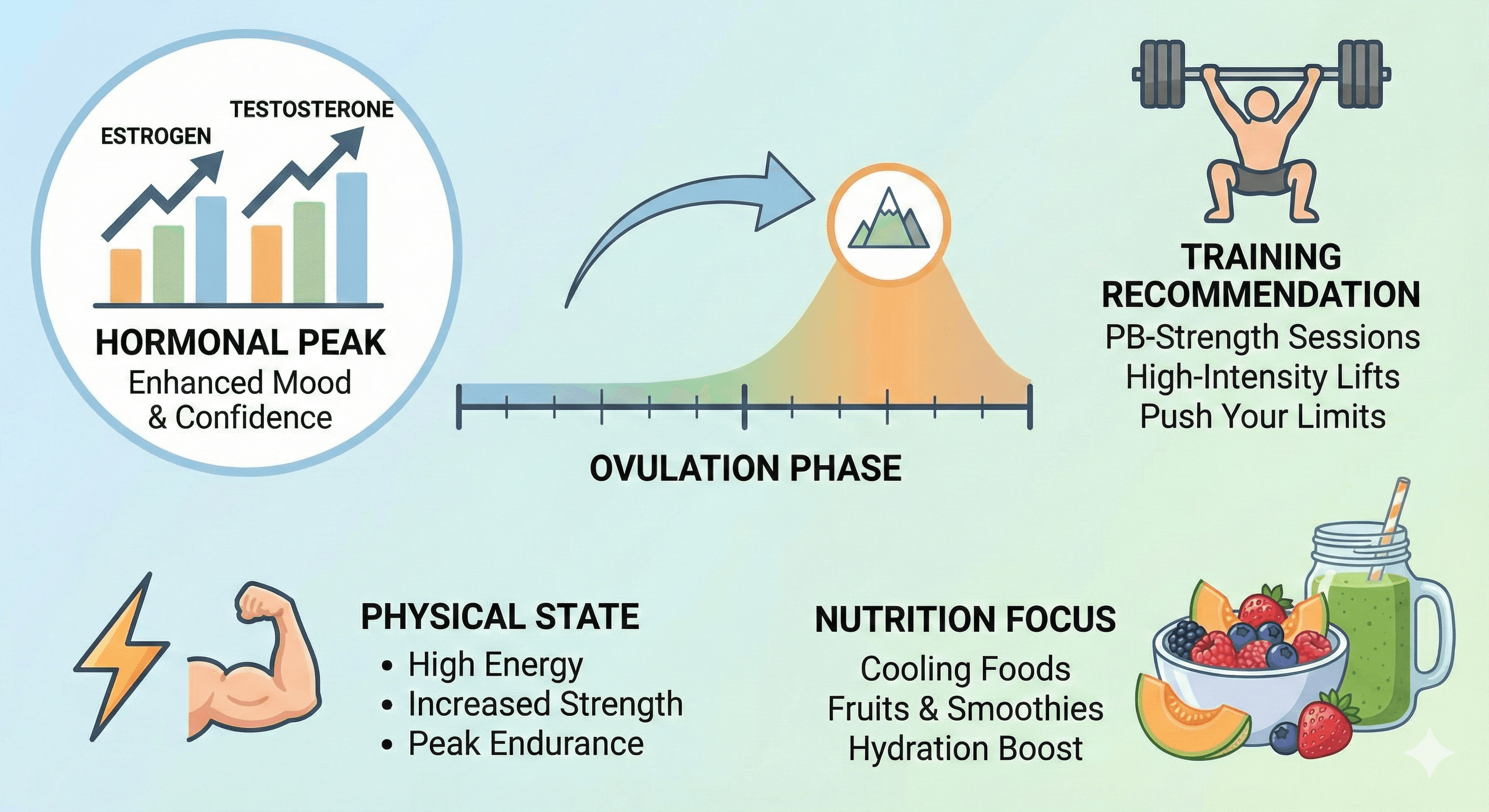 [Infographic showing ovulation with peak estrogen and testosterone, high energy, increased strength, cooling foods like fruits and smoothies, and suitability for PB-strength sessions.]